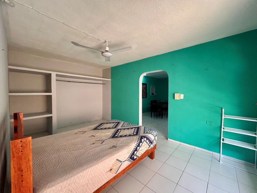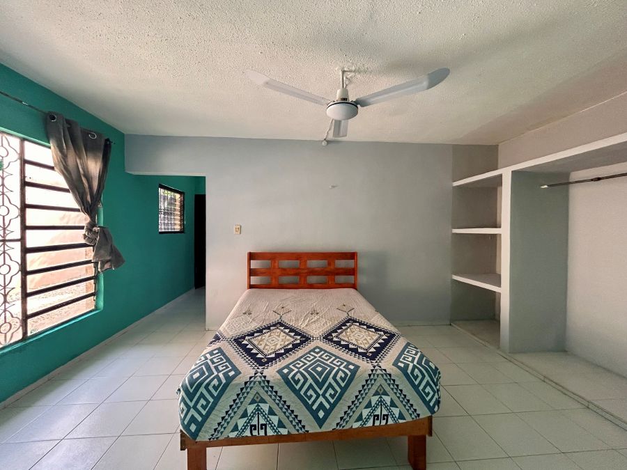 1 recamara con ventilador, cama y closet de cemento abierto